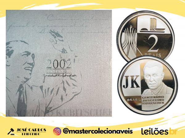 • Moeda do Brasil - 2 Reais JK 2002 - Cartela Comemorativa Centenário de Juscelino Kubitschek  - Prata (.999) - Proof - 28.0 g - 40.0 mm - Cat. P-735 - Folder original completo / certificado da CMB - Cunhadas apenas 12.902 unidades - Lance Livre