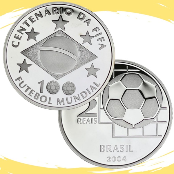 • Moeda do Brasil - 2 Reais 2004 - Estojo com a Moeda de 2 Reais 2004 - Centenário da FIFA - P-740 - Prata (.925) - 27 g - 40 mm - Alusiva aos 100 anos da Federação Internacional de Futebol - Com Cápsula. Estojo Original CMB sem certificado e com sinais do tempo.