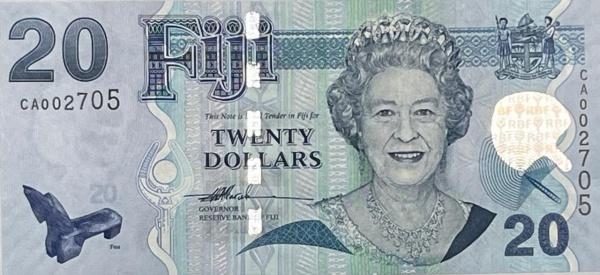 • Fiji - P-112a - Cédula de 20 Dollars 2007 - Flor de Estampa - Rainha - Nº CA002705 - As cédulas de 2 - 5- 10 - 20 - 50 e 100 Dolares de Fiji (lotes 70 a 75) são Matching Serial (Numeração Igual) - Oceânia