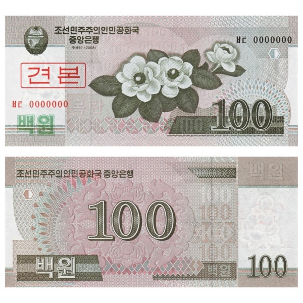 • Coréia do Norte - Cédula de 100 Won 2008 - P-61s - Specimen - Flor de Estampa