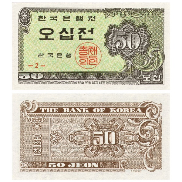 • Coréia do Sul - Cédula de 50 Jeon 1962 - P-29a - Flor de Estampa