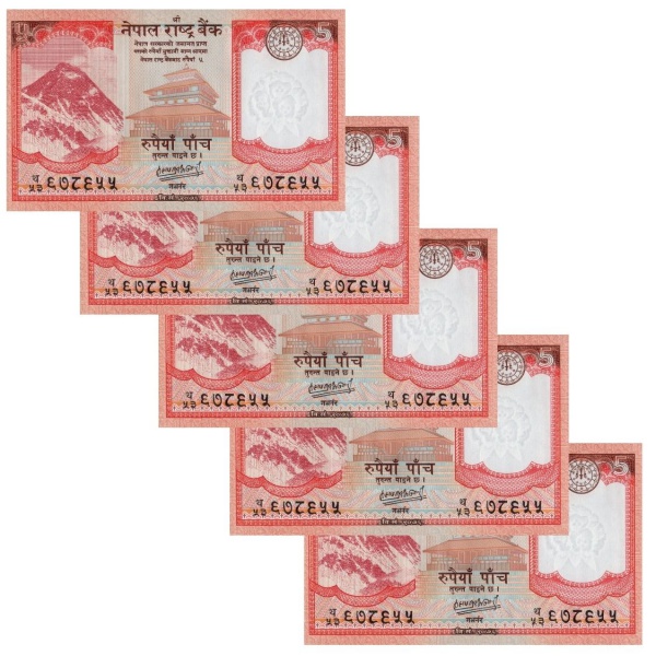 • Nepal - 5 Cédulas de 5 Rupees 2020 - P-76b - Sequência - Flor de Estampa