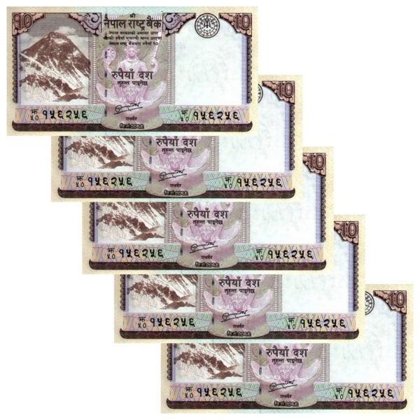 • Nepal - 5 Cédulas de 10 Rupees 2012 - P-70a - Sequência - Flor de Estampa