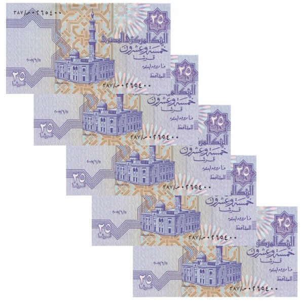 • Egito - 5 Cédulas de 25 Piastres 2007 - P-57h - Sequência - FE