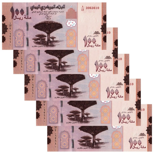 • Iemen - 5 Cédulas de 100 Ryals 2018 - P-37a - Sequência - Flor de Estampa