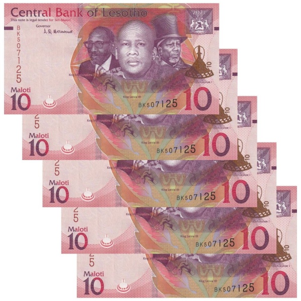 • Lesoto - 5 Cédulas de 10 Maloti 2021 - P-26a - Sequência - FE