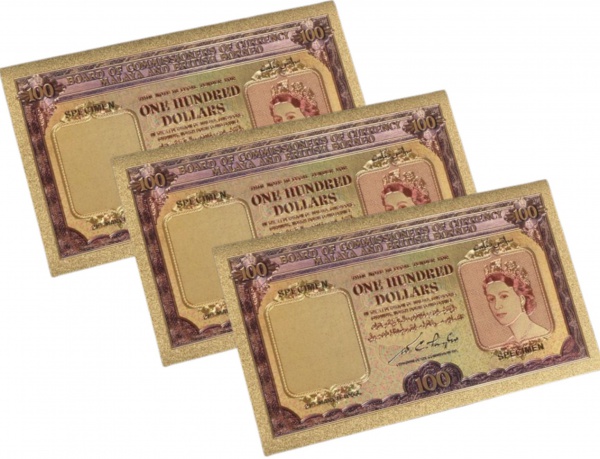 • Malaya e Borneo - 03 Cédulas Fantasia de 100 Dólares 1953 - Specimen Dourada - Material Plastico Flexivel - Peça muito Bonita