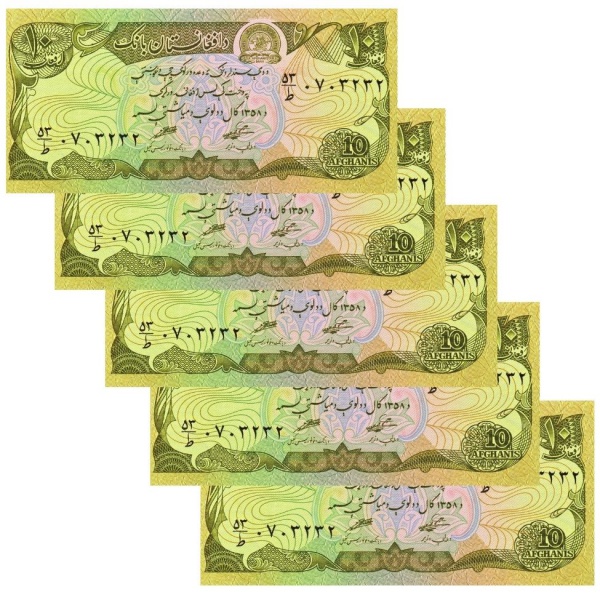 • Afeganistão - 5 Cédulas de 10 Afghanis 1979 - P-55a - Sequência - Flor de Estampa