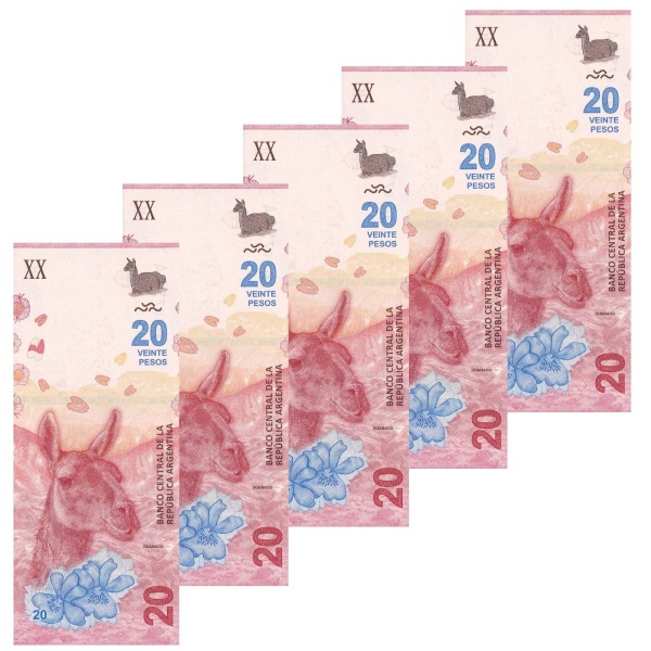 • Argentina - 5 Cédulas de 20 Pesos 2017 - P-361a - Guanaco - Sequência - FE