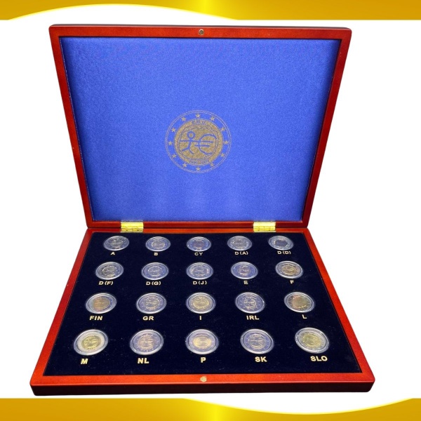 • Expositor de Madeira LUXO (Mogno) envernizada - Com 20 Moedas de 2 Euros Comemorativas dos 10 Anos da União Económica e Monetária e do Nascimento do Euro dos 20 Países: Áustria, Bélgica, Croácia, Chipre, Estônia, Finlândia, França, Alemanha, Grécia, Irlanda, Itália, Letônia, Lituânia, Luxemburgo, Malta, Países Baixos, Portugal, Eslováquia, Eslovênia e Espanha - Caixa almofadada - Original MDM Deutsche Munze, Alemanha - Peça Rarissima - Medidas da caixa 24cm x 30cm x 3cm