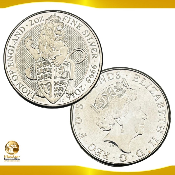 • Moeda do Reino Unido  - 5 Libras 2016 - Prata 0.999 - 2 Oz - 62.20g - 38.6mm x 5.5mm - Proof - Comemorativa - As bestas da Rainha - Leão da Inglaterra - Na capsula