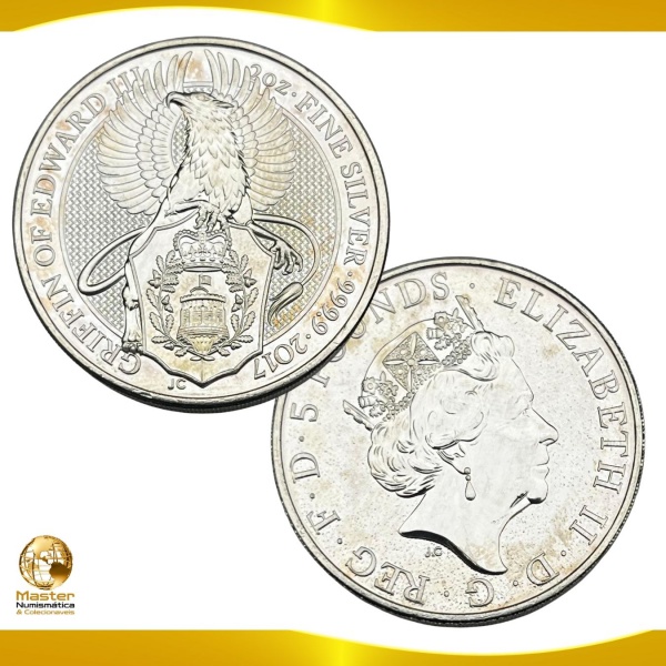 • Moeda do Reino Unido  - 5 Libras 2017 - Prata 0.999 - 2 Oz - 62.20g - 38.6mm x 5.5mm - Proof - Comemorativa - As bestas da Rainha - Griffin de Edward III - Na capsula