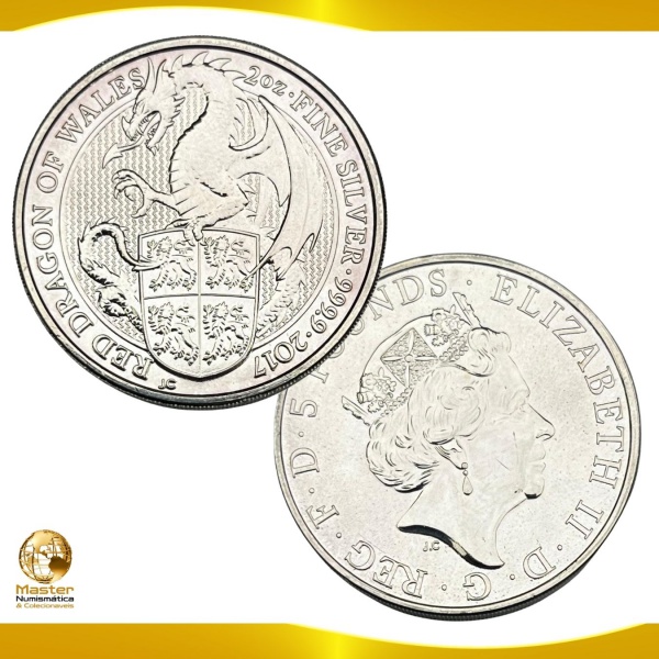 • Moeda do Reino Unido  - 5 Libras 2017 - Prata 0.999 - 2 Oz - 62.20g - 38.6mm x 5.5mm - Proof - Comemorativa - As bestas da Rainha - Red Dragon de Wales - Na capsula