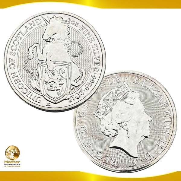 • Moeda do Reino Unido  - 5 Libras 2018 - Prata 0.999 - 2 Oz - 62.20g - 38.6mm x 5.5mm - Proof - Comemorativa - As bestas da Rainha - Unicórnio da Escócia - Na capsula