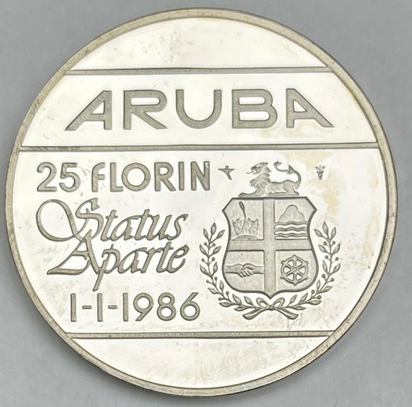 • Moeda de Aruba - 25 Florin 1986 - Prata 0.925 - 25.0g - 38.0mm - Proof - Comemorativa da Independência - Apenas 10.250 unidades - Na Capsula"