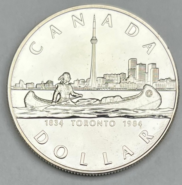 • Moeda do Canadá - 1 Dolar 1984 - Prata 0.500 - 23.3g - 36.0mm - Proof - Comemorativa - Sesquicentenário de Toronto - Na capsula Original Royal Canadian Mint