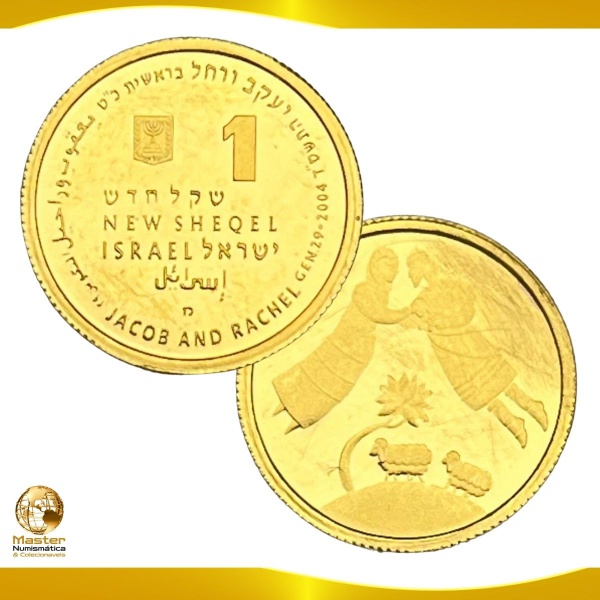 • Moeda de Israel -  1 Shekel Novo 2004 - Ouro 0.999 - 1.24g - 13.9mm - Arte Sacra - Jacó e Rachel - Proof - Flor de Cunho.