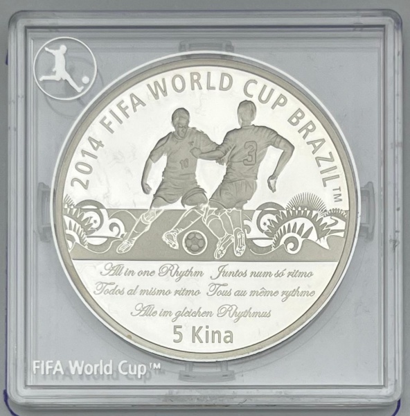 • Moeda de Papua Nova Guiné - 5 Kina 2013 - Prata 0.925 - 20.0g - 38.6mm - Proof - Coleção Copa do Mundo FIFA Brasil 2014 - Na capsula Original de Acrilico - Rara - Emissão 10.000 unidades